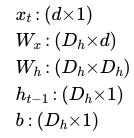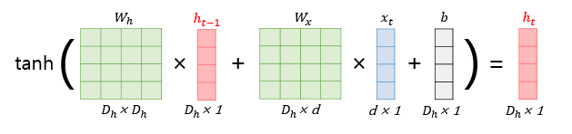 자연어 처리에서 RNN의 입력 x는 대부분의 경우 단어 벡터로 간주할 수 있는데, 단어 벡터의 차원을 d라고 하고, 은닉 상태의 크기를 Dℎ라고 하였을 때 각 벡터와 행렬의 크기는 다음과 같다.