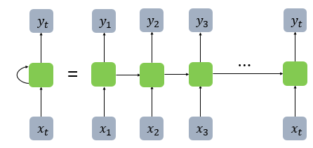 RNN을 표현할 때는 일반적으로 위의 그림에서 좌측과 같이 화살표로 사이클을 그려서 재귀 형태로 표현하기도 하는데,