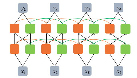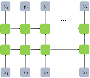 위의 그림은 순환 신경망에서 은닉층이 1개 더 추가되어 은닉층이 2개인 깊은(deep) 순환 신경망의 모습이다.