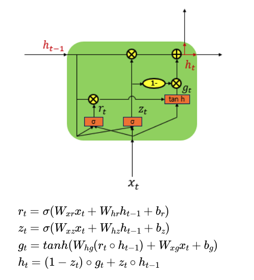 그리고 LSTM의 forget, input gate는 update gate로 통합, output gate는 없어지고, reset gate로 대체되었다.