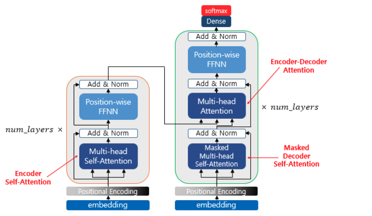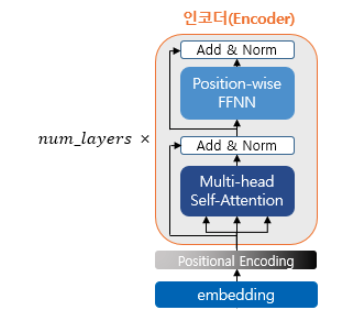 위의 그림에서는 멀티 헤드 셀프 어텐션과 포지션 와이즈 피드 포워드 신경망이라고 적혀있지만, 멀티 헤드 셀프 어텐션은 셀프 어텐션을