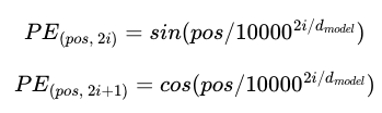 pos는 입력 문장에서의 임베딩 벡터의 위치를 나타내며, i 는 임베딩 벡터 내의 차원의 인덱스를 의미한다.