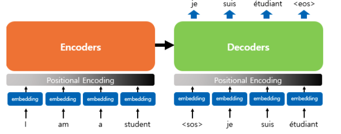 트랜스포머의 인코더와 디코더는 단순히 각 단어의 임베딩 벡터들을 입력받는 것이 아니라 임베딩 벡터에서 조정된 값을 입력받는다.