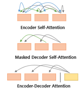 첫번째 그림인 셀프 어텐션은 인코더에서 이루어지고 두번째 , 세번째는 디코더에서 이루어진다.