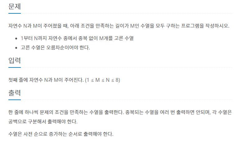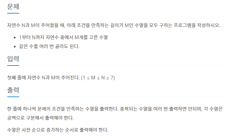 문제 자연수 N과 M이 주어졌을 때, 아래 조건을 만족하는 길이가 M인 수열을 모두 구하는 프로그램을 작성하시오. 1부터 N까지 자연수 중에서 M개를 고른 수열 같은 수를 여러 번 골라도 된다. 입력 첫째 줄에 자연수 N과 M이 주어진다. (1 ≤ M ≤ N ≤ 7) 출력 한 줄에 하나씩 문제의 조건을 만족하는 수열을 출력한다. 중복되는 수열을 여러 번 출력하면 안되며, 각 수열은 공백으로 구분해서 출력해야 한다. 수열은 사전 순으로 증가하는 순서로 출력해야 한다. 예제 입력 1 복사 3 1 예제 출력 1 복사 1 2 3 예제 입력...