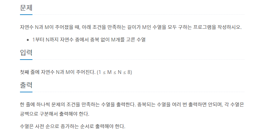 문제 자연수 N과 M이 주어졌을 때, 아래 조건을 만족하는 길이가 M인 수열을 모두 구하는 프로그램을 작성하시오. 1부터 N까지 자연수 중에서 중복 없이 M개를 고른 수열 입력 첫째 줄에 자연수 N과 M이 주어진다. (1 ≤ M ≤ N ≤ 8) 출력 한 줄에 하나씩 문제의 조건을 만족하는 수열을 출력한다. 중복되는 수열을 여러 번 출력하면 안되며, 각 수열은 공백으로 구분해서 출력해야 한다. 수열은 사전 순으로 증가하는 순서로 출력해야 한다. 예제 입력 1 복사 3 1 예제 출력 1 복사 1 2 3 예제 입력 2 복사 4 2 예제 ...