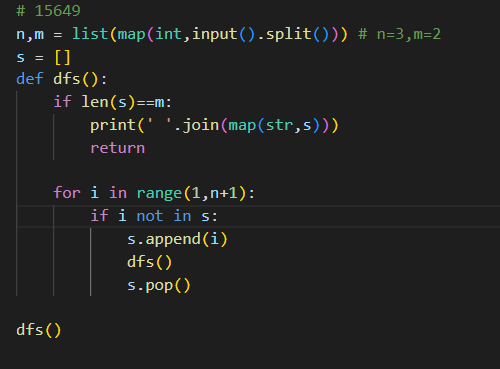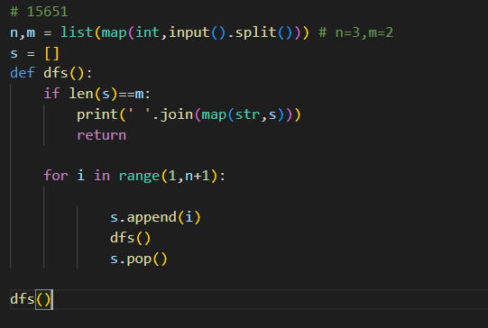 n과 m에 두 정수를 입력받고 그 후 s라는 리스트를 선언한 후 dfs() 함수를 정의한다.